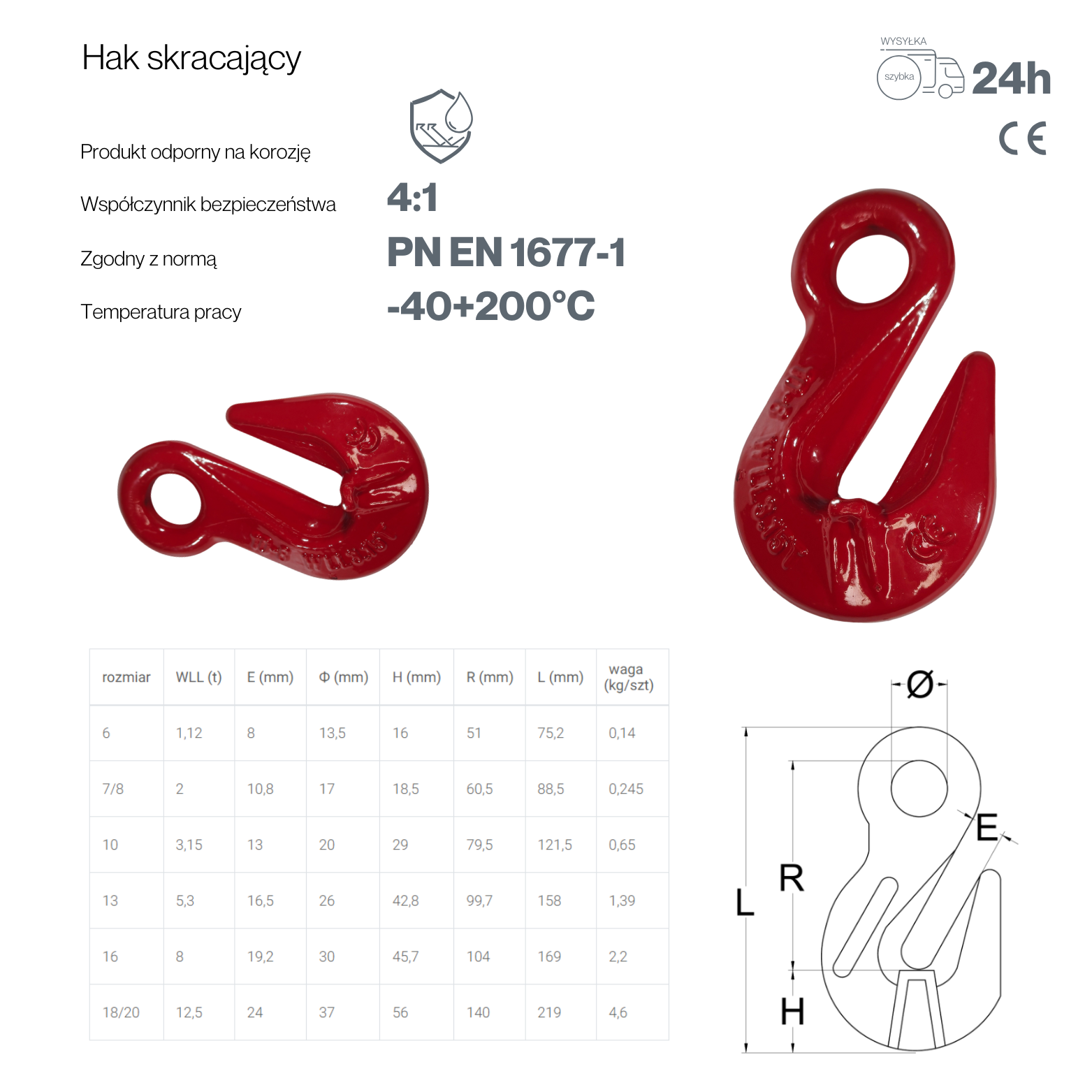 Hak skracający PN-EN 1677-1 to niezbędny element w systemach zawiesi łańcuchowych, umożliwiający regulację długości łańcucha w bezpieczny i prosty sposób. Dzięki wysokowytrzymałym materiałom, odporności na korozję i specjalnej konstrukcji, która zapobiega przypadkowemu wypięciu łańcucha, haki te są szeroko stosowane w przemyśle budowlanym, transportowym, metalurgicznym i wielu innych. Spełniając europejskie normy bezpieczeństwa, hak skracający zapewnia niezawodne działanie nawet w najbardziej wymagających warunkach.