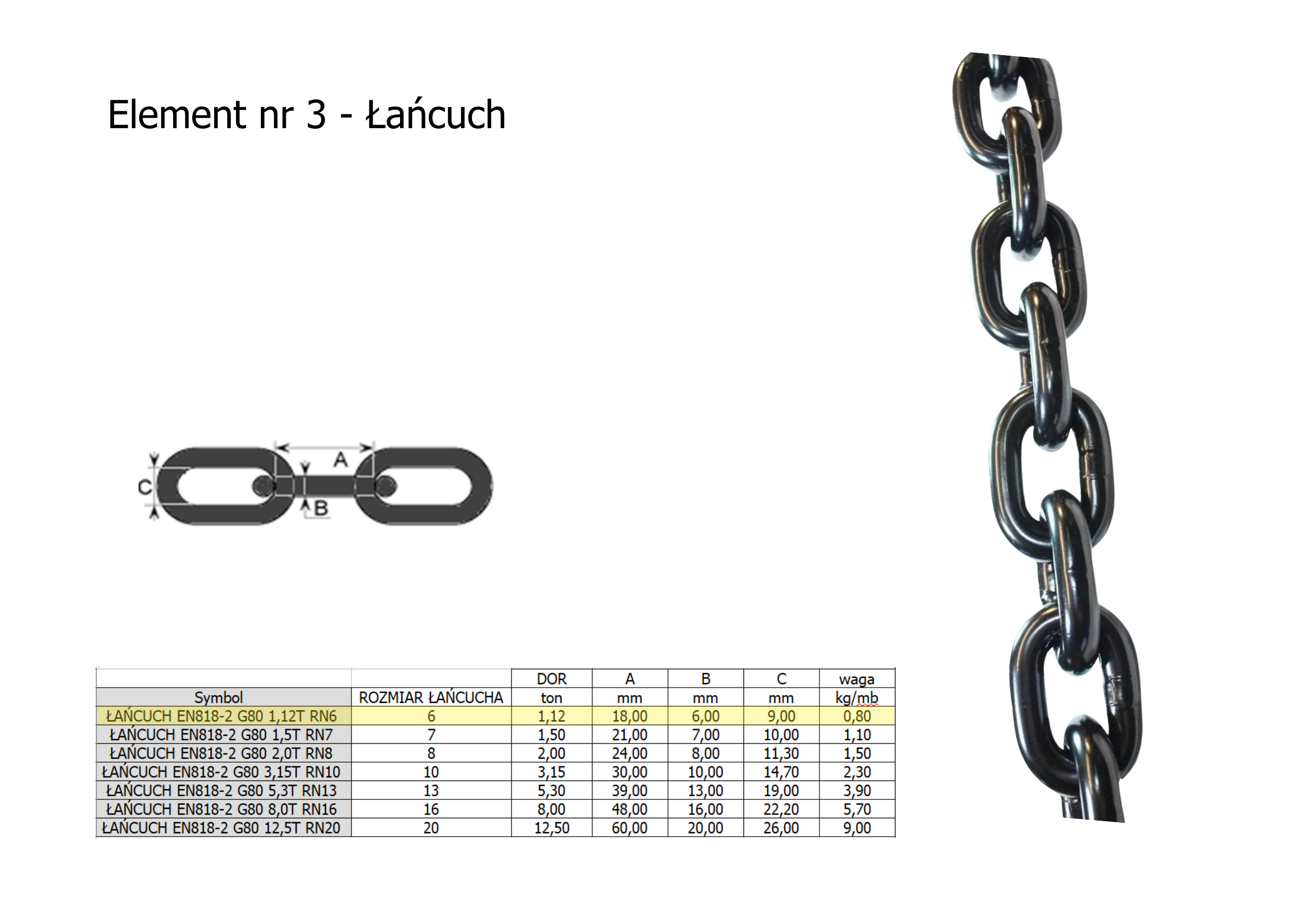 - Cięgno (łańcuch) – wykonane ze stali o wysokiej wytrzymałości, w standardzie klasy 8.