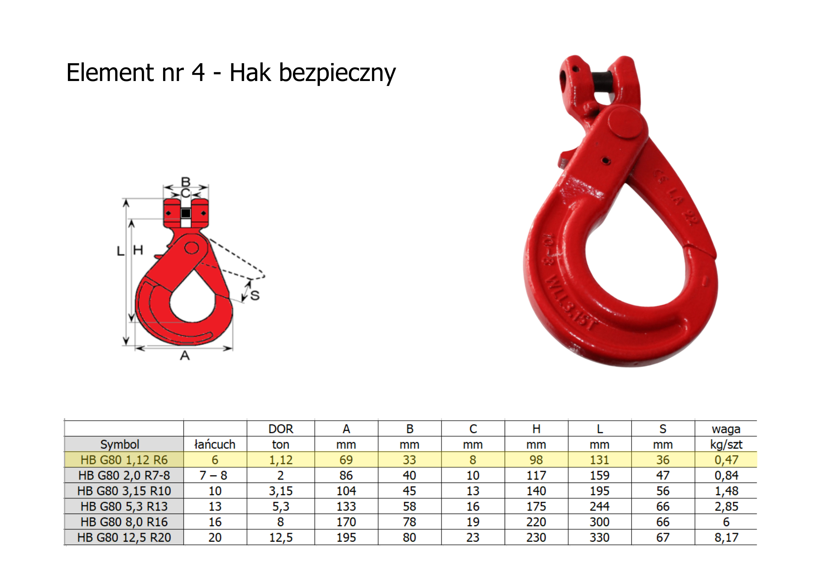 - Hak roboczy – na końcu zawiesia, którym bezpośrednio chwyta się podnoszony ładunek (dostępne kilka wariantów).