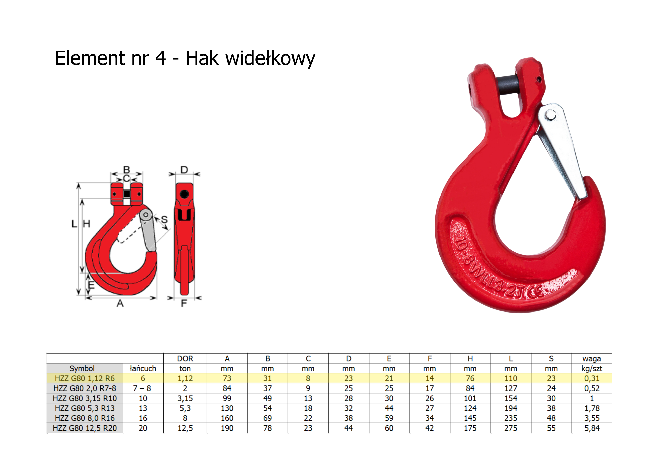 - Hak roboczy – na końcu zawiesia, którym bezpośrednio chwyta się podnoszony ładunek (dostępne kilka wariantów).